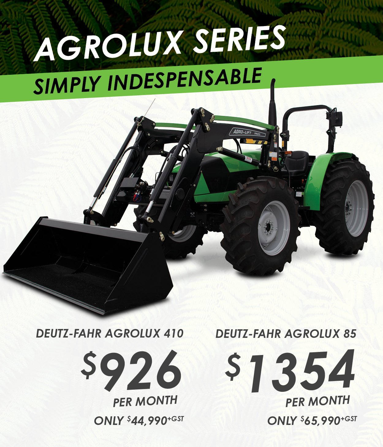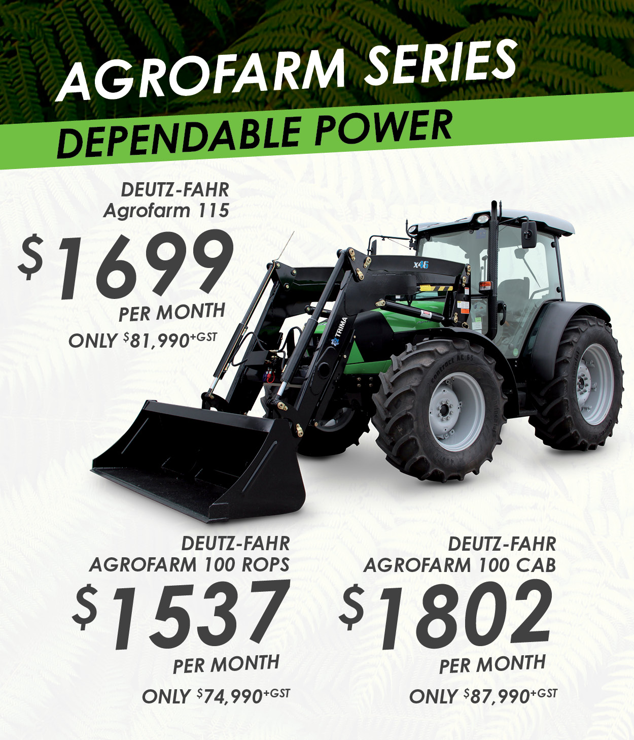 * Requires 30% deposit and full GST in month three, 2.95% interest over 36 equal monthly payments. Normal lending criteria applies. Terms and conditions apply. Offer ends 31/12/2019 ** Terms and conditions apply. Go to deutztractors.co.nz/trydeutz for detailed terms and conditions.